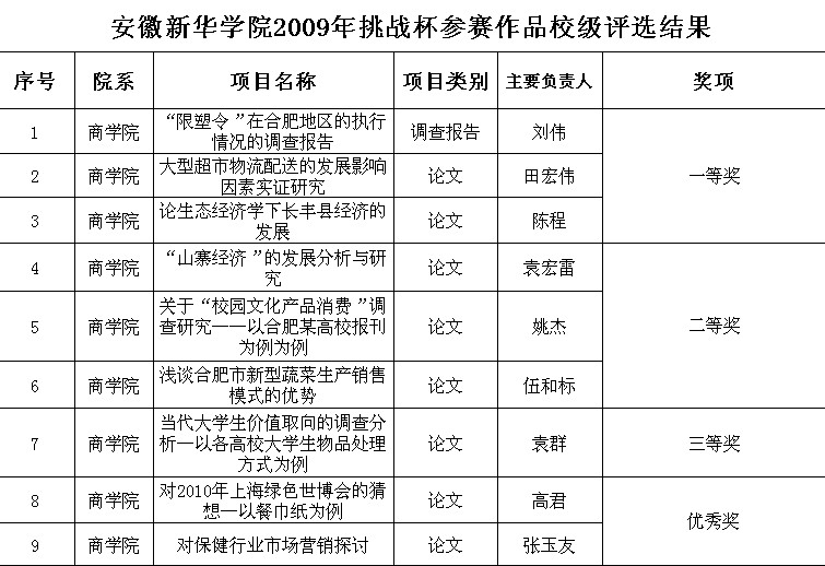喜讯:安徽新华学院2009年“挑战杯”大赛商学院再创佳绩