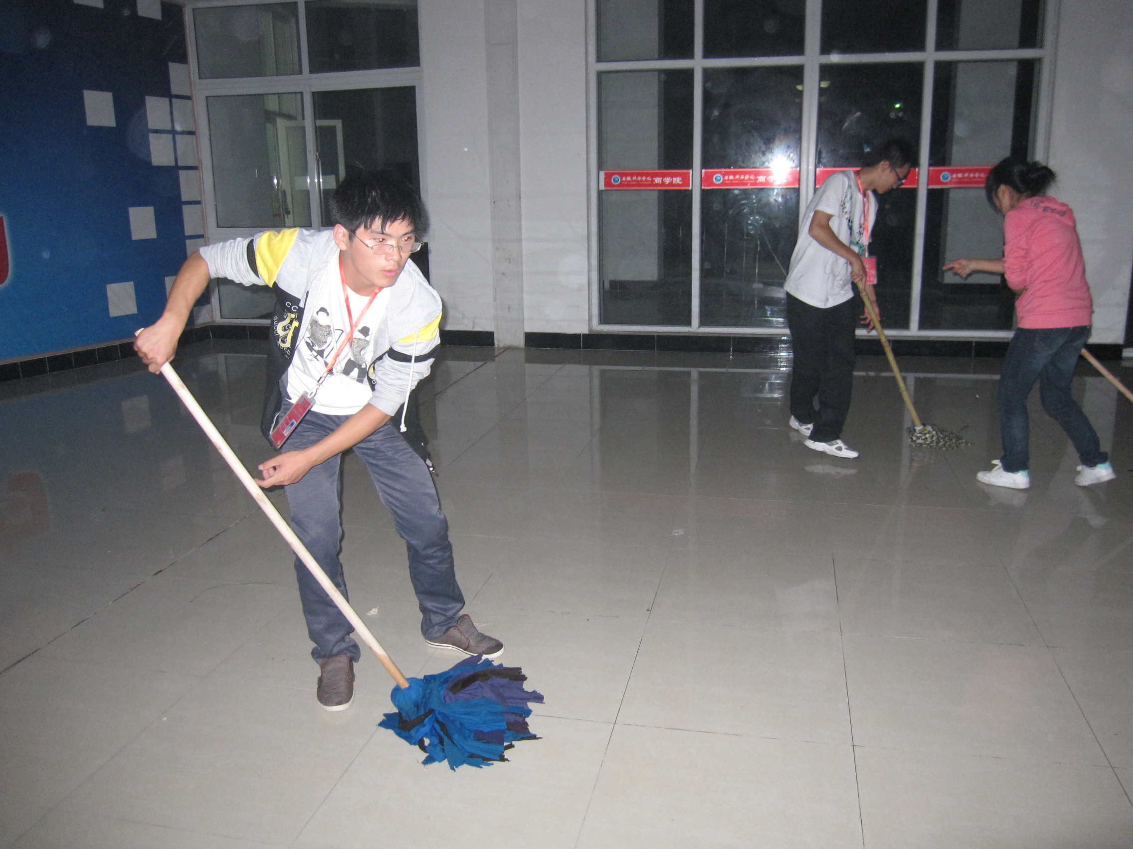 2011年10月11日晚九点整,商学院团总支学生会11个部门200余名成员准时汇集在商学院东大厅进行大扫除活动。