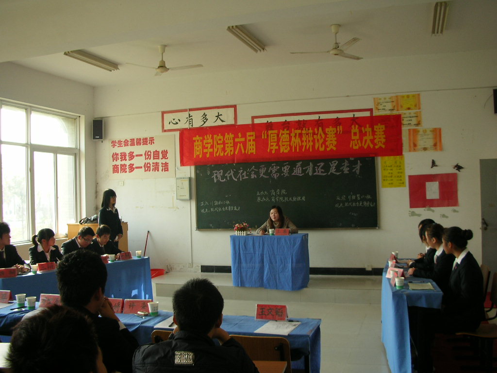 第六届“厚德杯”辩论赛历时近一个月,共有大一、大二年级52个班级参加,经过海选、复赛、决赛的重重筛选,最后有四个班级进入了总决赛。比赛还未开始,现场早已座无虚席。决赛分为两场举行。辩题分别为“现代社会更需要通才还是专才”和“成功作品应不应该拍续集”。